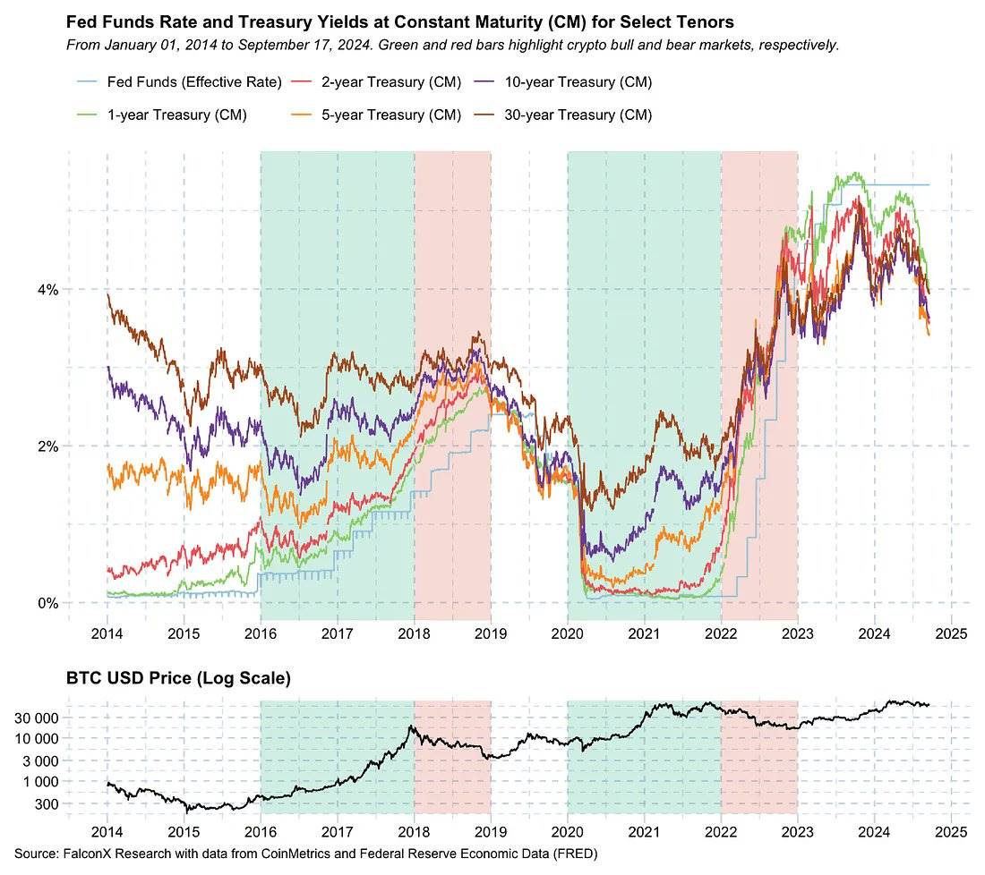 With the Federal Reserve implementing a 50 basis point rate cut in September, the market may enter a low-interest-rate period, similar to the environment that drove the crypto bull markets in 2017 and 2020, as shown in the chart below. Bitcoin (and cryptocurrencies) bull markets typically occur in low-interest-rate environments (green areas), while bear markets often happen during periods of rising rates (red areas).