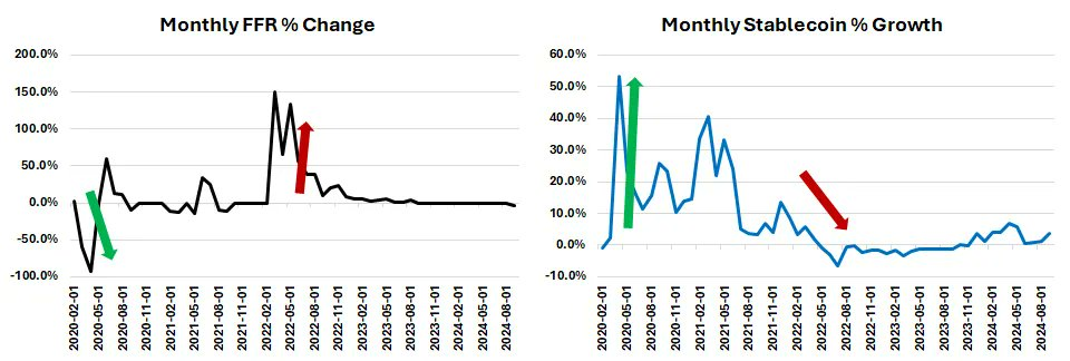 In the previous cycle, the Federal Funds Rate (FFR) showed an inverse relationship with the growth of stablecoin supply, as illustrated in the chart below. With rates declining again, stablecoin supply is expected to increase, providing more "dry powder" for the accelerated development of DeFi.