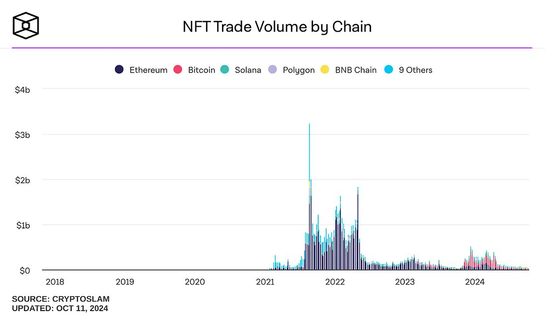 For instance, even with a brief resurgence of Bitcoin Ordinals in 2024, the daily trading volume of NFTs continues to decline.