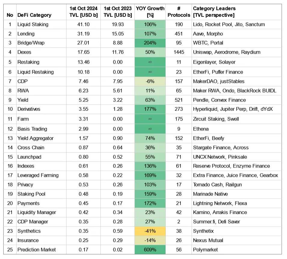 In contrast, DeFi has proven its product-market fit. The growth of core DeFi categories, such as liquid staking and lending, has seen year-on-year growth exceeding 100%, demonstrating its appeal. At the same time, new billion-dollar categories, such as restaking (Eigenlayer) and base trading (Ethena), which had zero TVL a year ago, are now rapidly emerging. This explosive growth showcases the composability and permissionless nature of DeFi, where new financial "Legos" are built on top of each other to unlock new application scenarios.