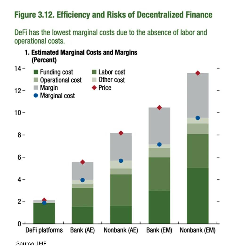 To demonstrate how DeFi outperforms traditional finance (TradFi) in efficiency, we can compare the costs of operating services between the two. According to research from the International Monetary Fund (IMF), the analysis is as follows: