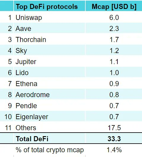 Currently, the total market capitalization of all DeFi protocols is approximately $33 billion, accounting for only 1.4% of the total cryptocurrency market cap of $2.3 trillion.