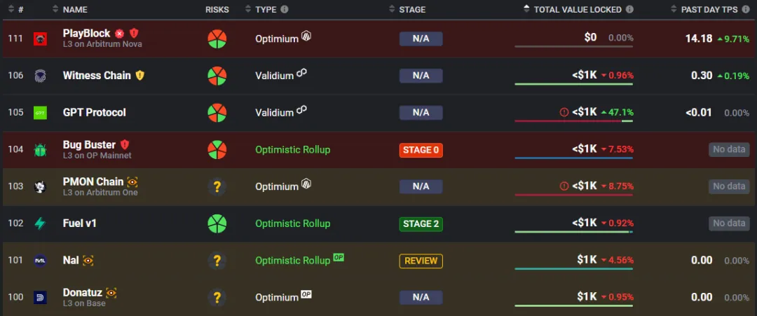The Layer2s at the bottom have almost zero TVL.