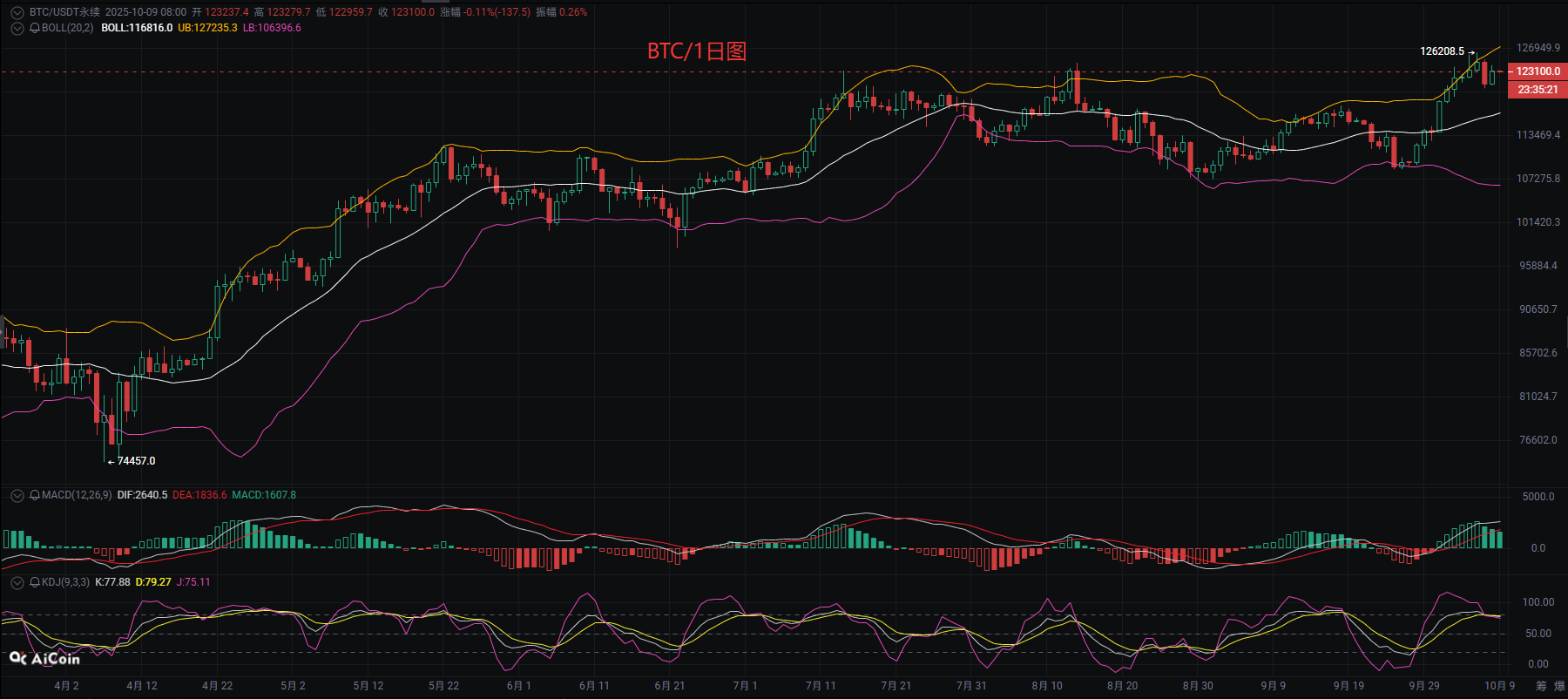 4小时级别近期出现大阳线突破123000整数关口后迅速回踩,形成长上影线结构。10月08日00:00至10月09日00:00连续三根实体超过1000点的K线构成急涨形态。日线级别10月06日126199高点和10月07日125126高点形成双顶雏形,但10月08日收盘重新站上123000关键位,短期空头信号被破坏。MACD:4小时级别DIF(312)下穿DEA(485),柱状体翻绿扩大;但日线级别仍保持金叉状态,周线MACD处于零轴上方强势区。EMA:价格在4小时级别回踩EMA30(122309)获支撑,日线EMA7(122014)、EMA30(117364)呈多头排列,120日均线(112442)为长期强支撑。上方压制关注123800-124800区域,下方支撑关注120500区域。