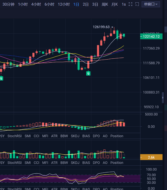 一个假期结束,大饼的行情再一次的完成了历史新高的突破,原因有很多,包括各种利好消息的刺激,使得行情连续拉升,将历史高点来到了126000上方。在假期前,我们是打算以118000的突破来作为行情的趋势反转位置,然后去做了空单布局,就是想要以前一轮反弹的高点形成压制,但118000实际上并没有形成压力,在利好的刺激下,行情强势拉升,这也使得我们做空计划最终失败。截止到目前,行情从高位有一定小幅回落,最低至120600附近,当前日内处于高位震荡之中。