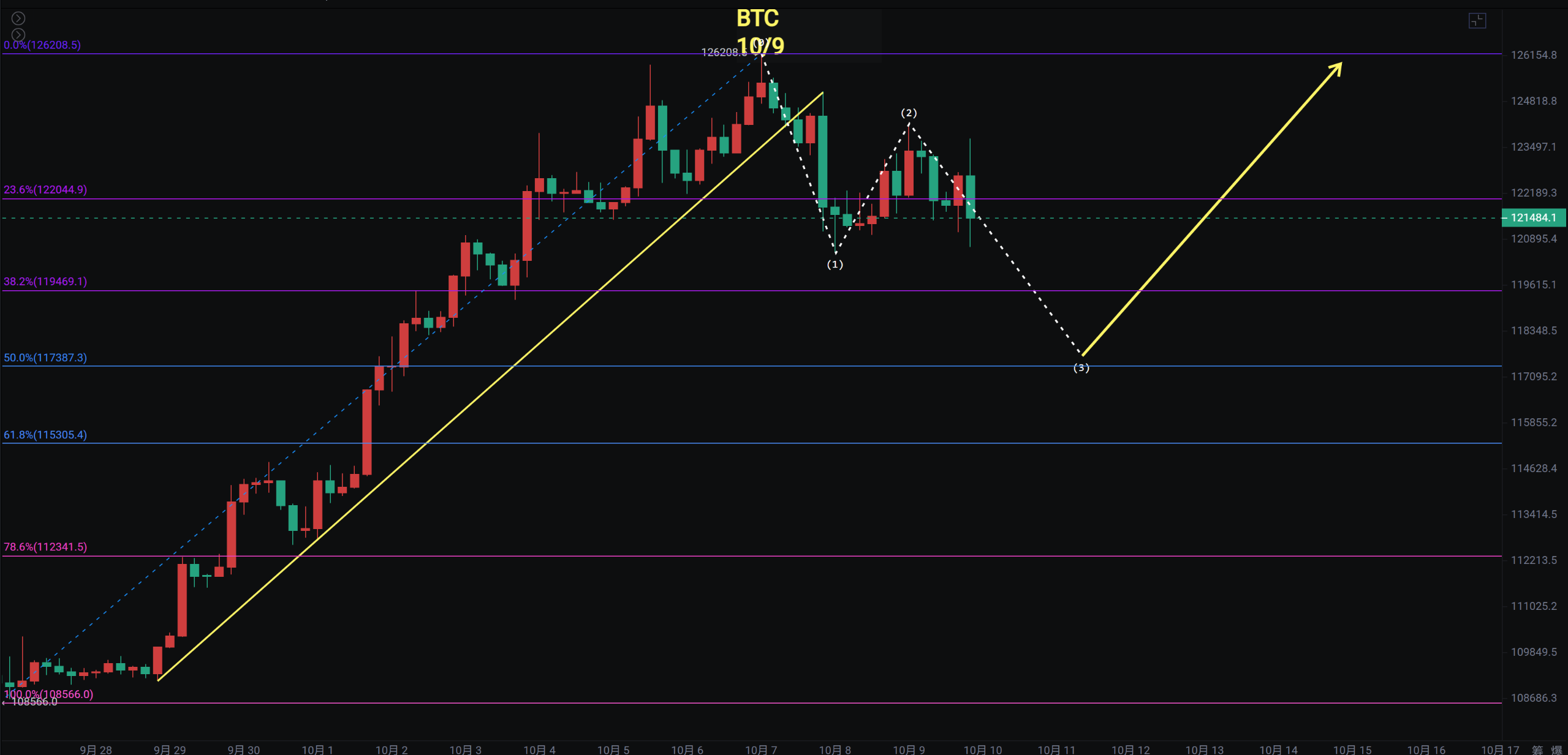 4小时级别上升支撑线跌破,目前回踩0.382至0.236之间,此前做多的朋友,可考虑在0.5至0.68之间接回,也就是117000至117500附近。整个日线级别从七月中旬到现在,一直维持震荡的概率偏大,Q4季度仍然比较看好。