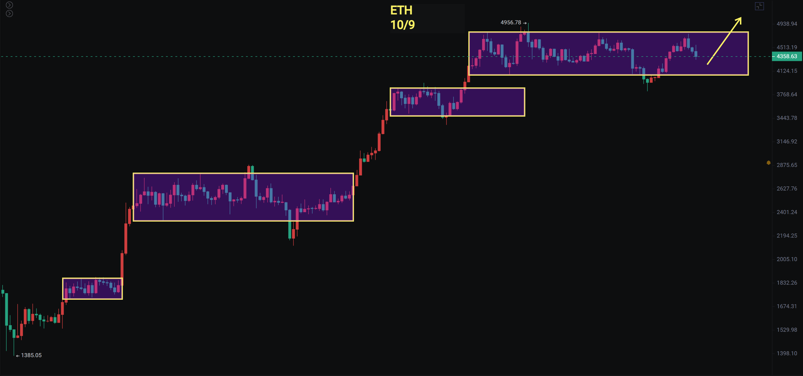 以太走的结构还是非常明显,仍在箱体内部震荡,最近的支撑在4200。从8月9号突破4100以来,已经震荡了61天,之前公子也说过,五月份到七月份也是震荡两个多月,所以最近的假跌破收回后,最好不要再继续跌破,否则后续走势会更麻烦。