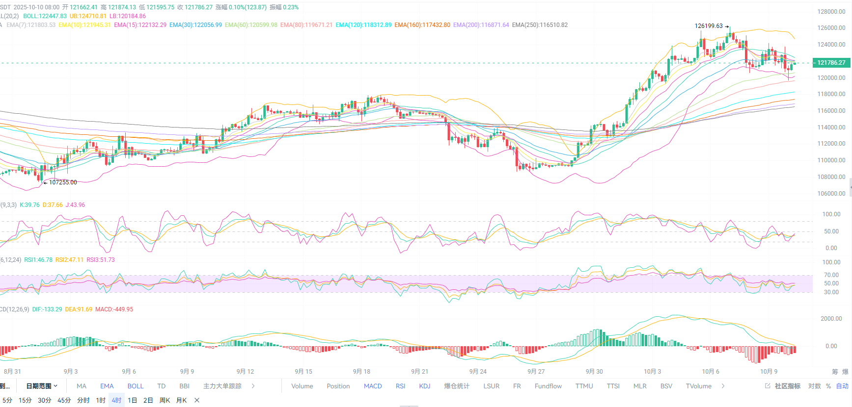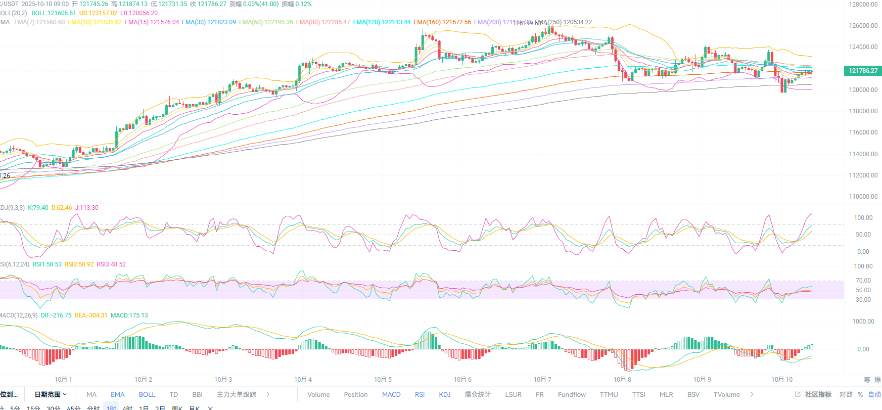 比特币现价121700附近,今日凌晨在下行突破12万关口后再次形成至当前1H中轨上方位置,目前1H通道维持平行,MACD中表现来看绿柱再次放量增加,DIF与DEA也是成功收口形成金叉向上,KDJ与RSI继续上行接近超卖区,表明短期上方空间还未走完,需关注EMA120,EMA80,EMA60三线阻力,顶部关注上轨位置。