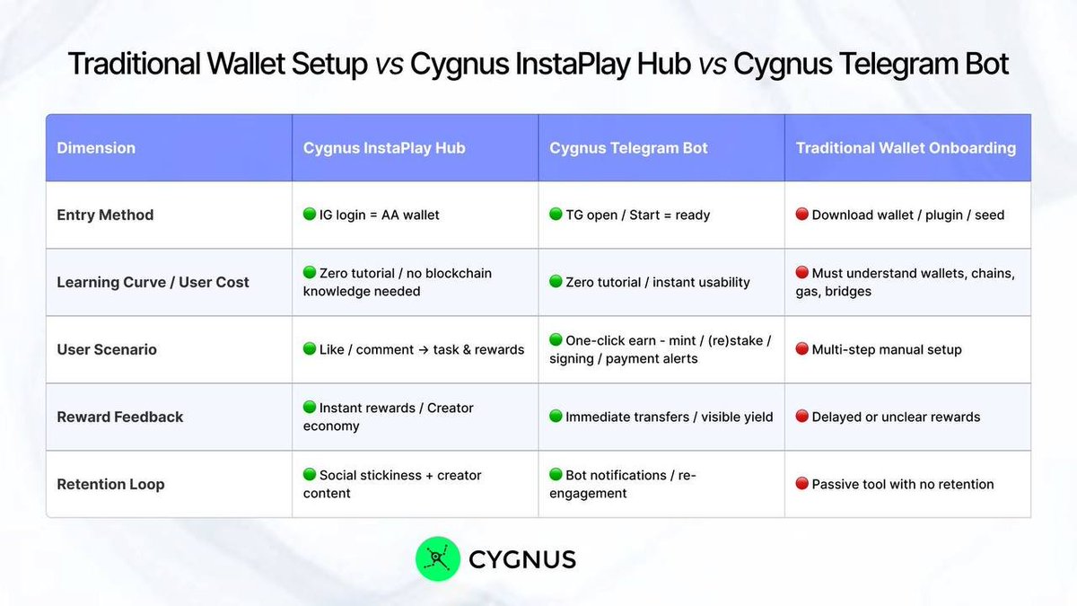 Cygnus 的目标是极致简单:让用户在熟悉的社交场景中,一键完成链上互动与收益,实现“社交即钱包,互动即资产”——