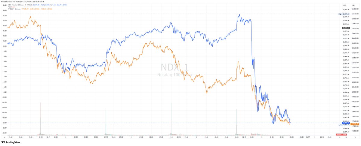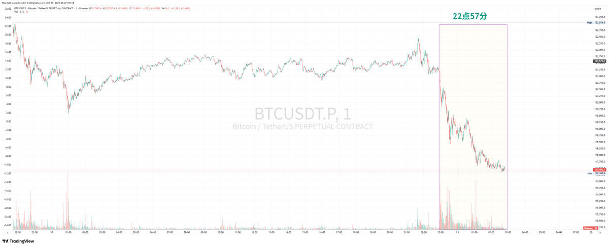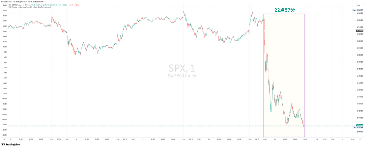 果然和预测的一样,川普在北京时间22点57分发的这篇文章,然后 $BTC 也是在这个时间开始下跌的,顺便说一下啊,标普500和纳斯达克也是在这个时间同步下跌的,毕竟加密货币和美股还是高度相关的。