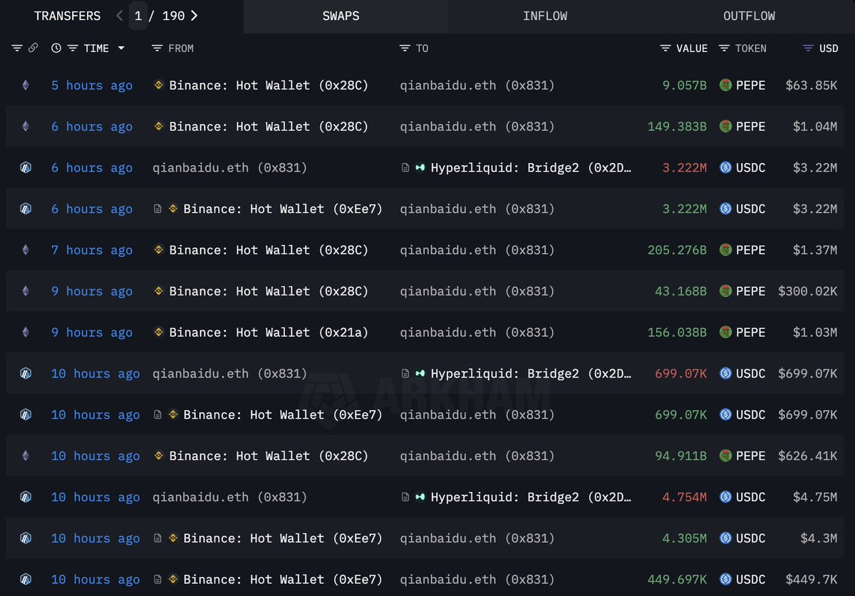 • qianbaidu.eth withdrew 657.8B $PEPE($4.44M) from #Binance and deposited 8.67M $USDC to #Hyperliquid to buy $HYPE.