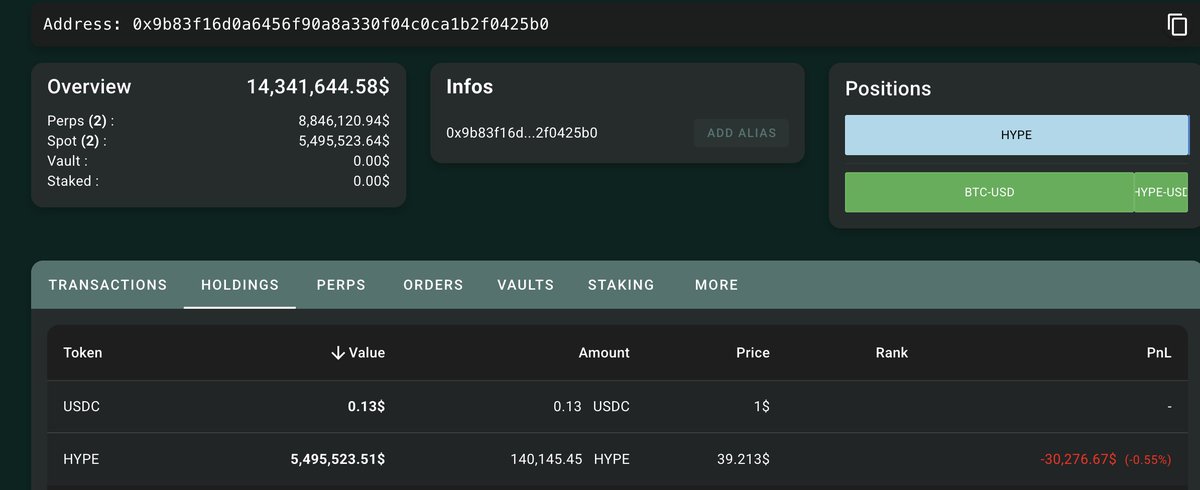 • Whale 0x9b83 bought 140,145 $HYPE($5.5M) and also went long on $BTC and $HYPE.