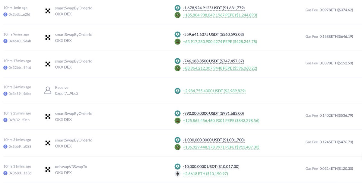 • Whale 0x2bfb spent 4.97M $USDT to buy 600.88B $PEPE.