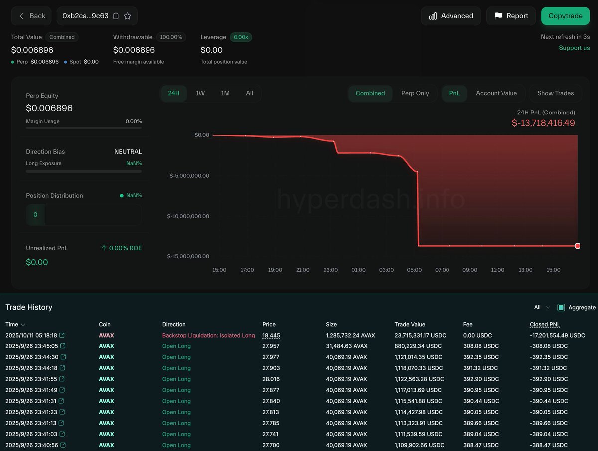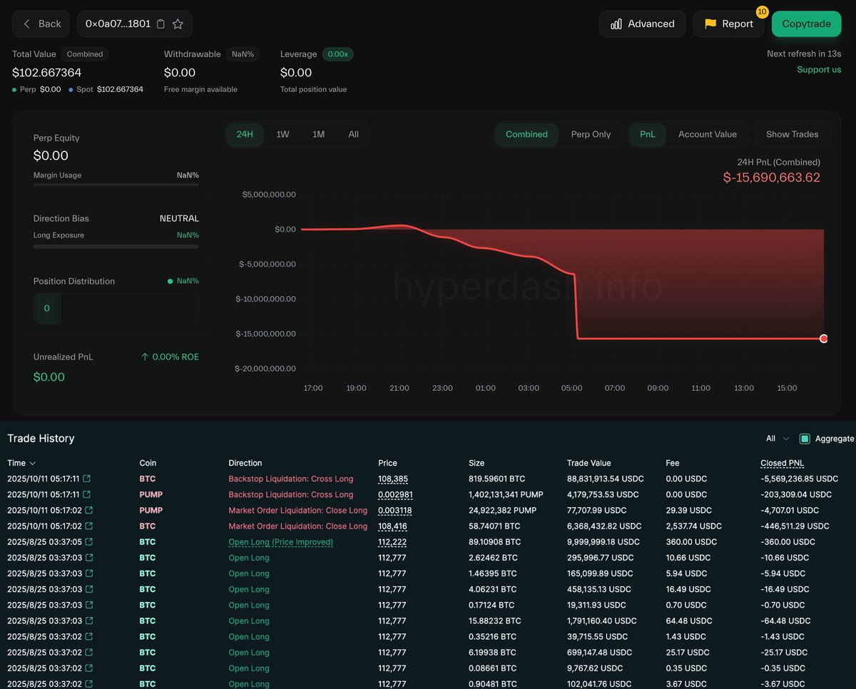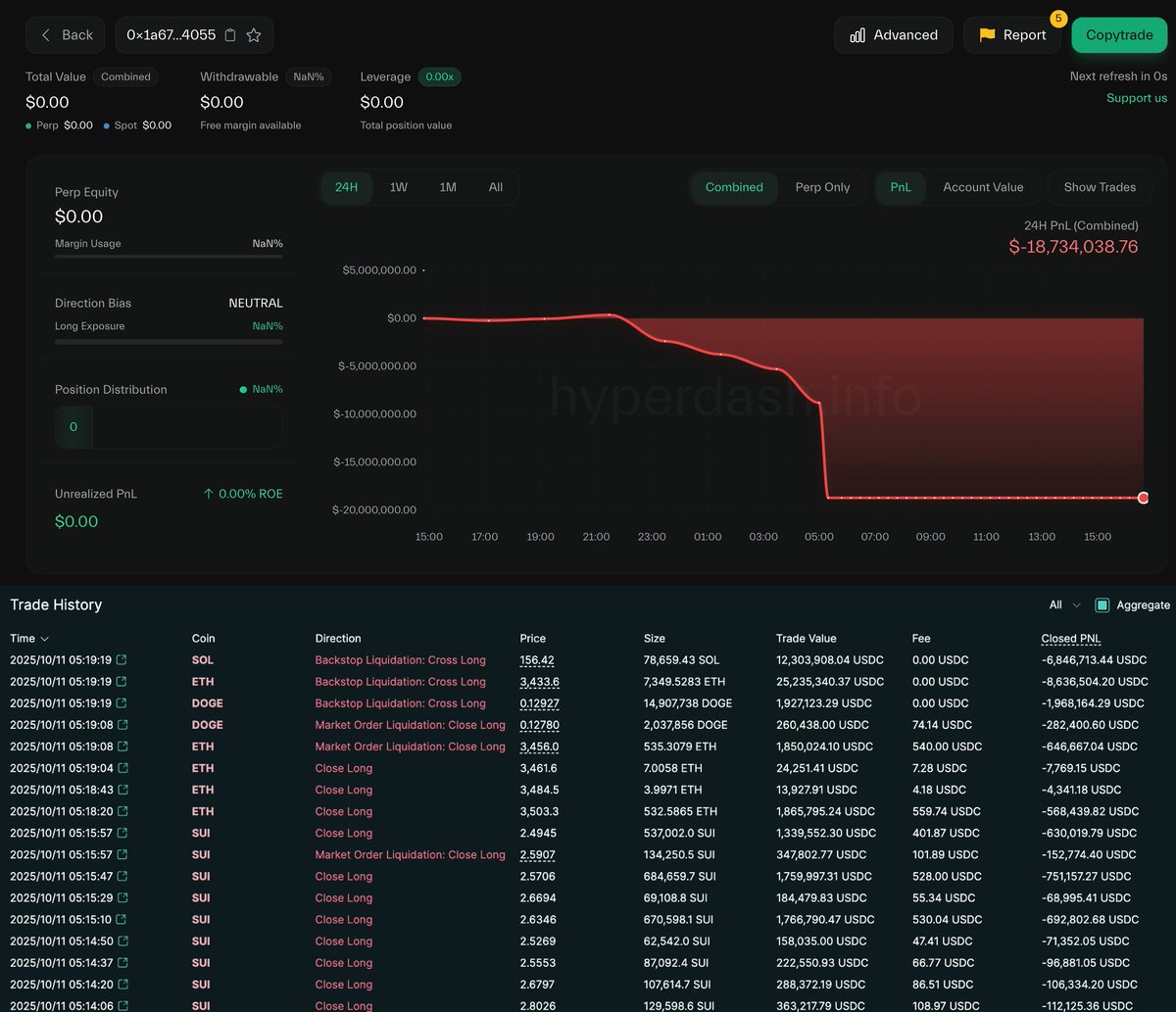 Four traders were completely liquidated on #Hyperliquid during the market crash — each losing over $10M!