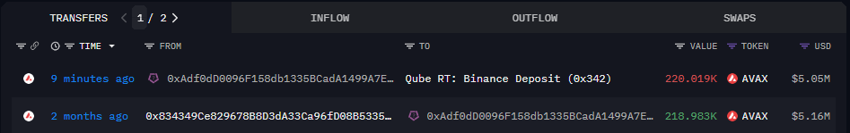 15 minutes ago, #Qube_RT deposited 220k $AVAX (~$5.05M) into #Binance