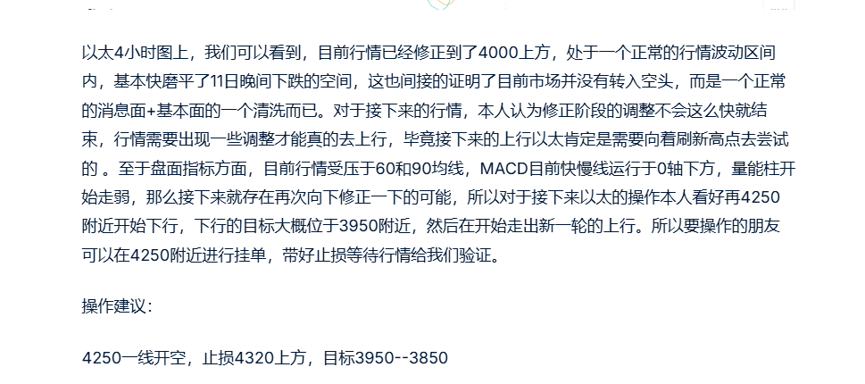10-13日本人在文中说到,在行情之后的修正中,不可能直接就走出新一轮的趋势,而是会有一个震荡,所以直接公告支出在4250一线开空,目标看到3950-3850.而行情也是很配合,于14日凌晨走到4250上方,最高给到4293后开始下行,最终于晚间成功抵达我们的目标区间,最低给到3885一线,成功获利离场,在这里恭喜大家,如果大家有想要交流或觉得自己把握不好行情的可以联系本人,Love_2025fa(VX)。