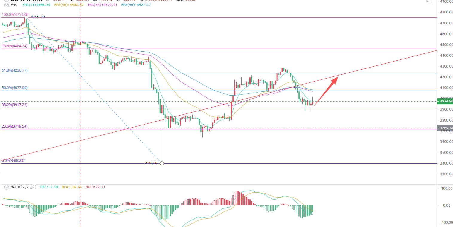 根据我们周一的判断,行情会先下行一波之后再上行,目前前半段已经被验证成功走出,那么我们有底气相信后半段也能实现,所以接下来的操作个人会选择找位置去开多。而结合盘面去看,行情在回撤分割线38.2%(3900)一线获得支撑,有向上运行的想法,那么我们进场也完全可以依托这个位置进场。但因为凌晨美联储主席会有讲话。