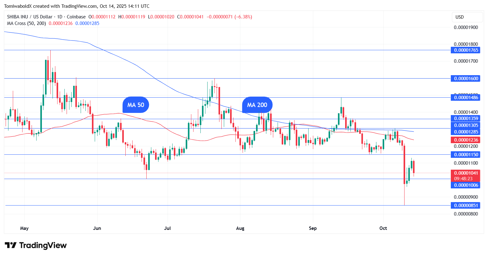 SHIB's current price point represents a make-or-break level for Shiba Inu, as a further drop might cause it to add an extra zero to its price, potentially targeting $0.00000959 or even the $0.0000085 price floor set during Oct. 10 crash.