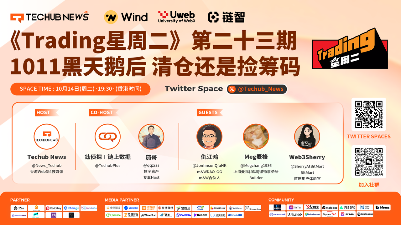 在Techub News联合Wind、Uweb、链智主办的《Trading星周二》第二十三期活动中,主持人数字资产专业Host茄哥携手三位重量级嘉宾——m&WDAO OG m&W合伙人仇江鸿、上海曼昆(深圳)律师事务所Builder Meg麦格,以及BitMart首席用户体验官Web3Sherry,围绕“1011黑天鹅后 清仓还是捡筹码”这一热点主题展开深度探讨。活动通过推特Space形式,聚焦10月11日特朗普突发关税政策引发的市场剧震,嘉宾们从宏观政策、情绪面、结构性机会等多维度剖析行情,分享实战洞见。尽管现场技术小插曲(如麦信号调试和网络波动)频现,凸显Web3社区的互助韧性,大家仍“互相慰藉”浮亏焦虑,强调“牌桌上不能说散就散”,帮助投资者理性应对极端行情。三个话题层层递进,从暴跌成因到投资策略,再到稳定币教训,全方位拆解事件,提供清仓/捡筹码的决策框架。