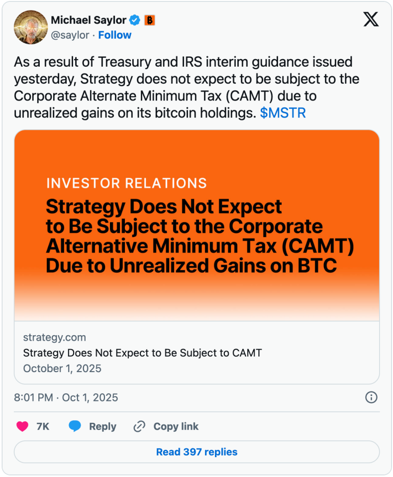 稳定市场预期:若政策得以明确,投资者对于税收监管的巨额税负的担忧将被削弱,政策风险导致的溢价也会降低。这对加密行业整体估值、加强资本市场信心有正面推动作用。像MicroStrategy这种重仓比特币的公司,其市场估值可能因为税收秩序的明确而提升。投资者信心会因为秩序的稳定和市场增值而增加。