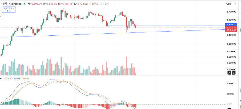 ETH走势同样不容乐观,下午跌破了上次文章中提到的3870的关键位置。如后续继续回踩至前低,有可能形成一个头肩顶的造型,非常不友好。