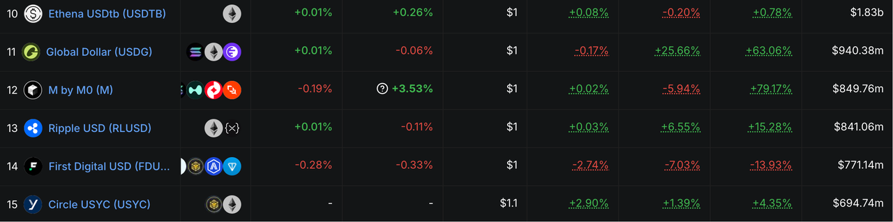 在多重布局下,直到「10.11」市场闪崩之前,CoinMarketCap 数据显示,10 月 5 日,XRP 市值一度达到 1834 亿美元,并短暂地超越全球最大资产管理公司贝莱德(BlackRock)的市值(约 1800 亿美元)。分析师认为,此轮上涨和看涨情绪的支撑,可能源于 Ripple 正在加紧推进的美国国家信托银行执照申请和稳定币跨境支付业务,因此被市场视为 XRP 的长期利好催化剂。截至撰稿时,DefiLlama 数据显示,RLUSD 市值约为 8.4 亿美元,月度涨幅超 15%,排在第 13 位。