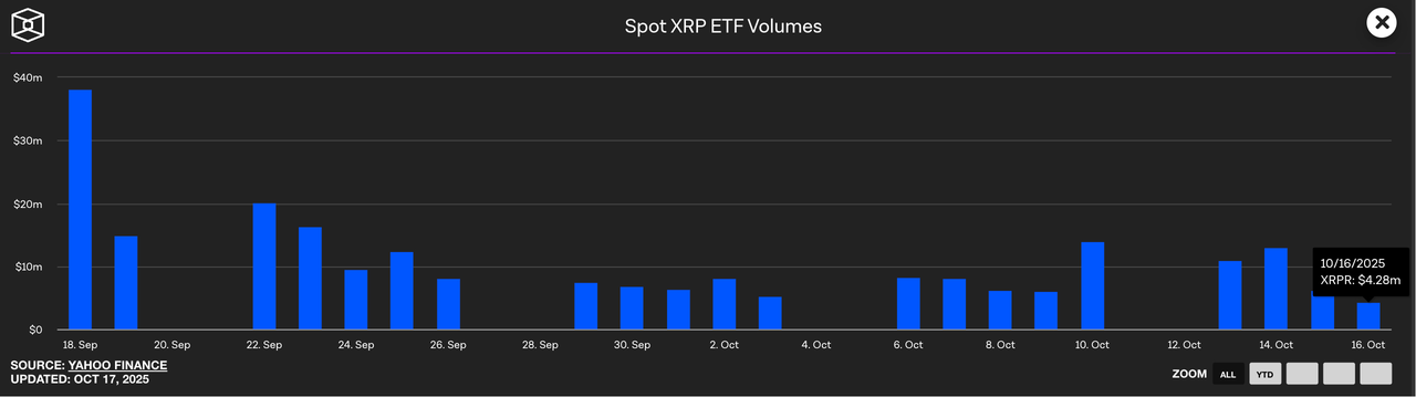 然而,遗憾的是,REX-Osprey XRP ETF 首日的辉煌表现仿佛只是昙花一现,此后其交易量持续下滑,再未重现往日荣光。The Block 数据显示,10 月 16 日,XRPR 的交易量约为 428 万美元,创下上市以来的最低水平。