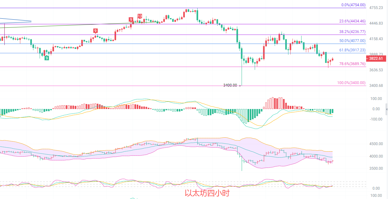 四小时K线来到了黄金分割线0.786支撑3689之上,关键压力位关注3917,EMA趋势指标快慢线加速分离拉开身位,行情不排除急涨急跌的动能存在,MACD出现缩量减少的情况,短线价格受阻3840,布林带下轨支撑下压到了3725,行情来到了极端超卖的边缘,下一波破前低以后可以考虑北上试仓,暂时以南下为主