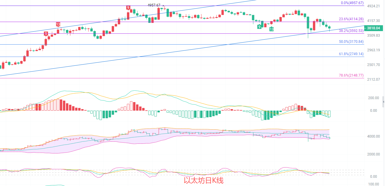 日K线发稿前最高3948,最低3670,K线跌破EMA120一线3866,现在支撑变压力,下一个支撑关注382一线3592,布林带下轨3690已经跌破了一次再次跌破也是情理之中,轴线支撑关注4550,南下的币友可以继续持有,做好回撤止盈的准备