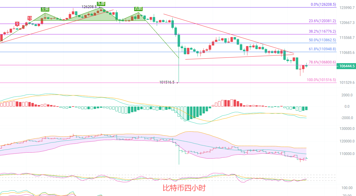 四小时K线压力位连续五次下压,支撑位下压四次,第五次会不会出现?K线目前在0.786一线横盘,加上周末主力大概离在106800一线来回走,EMA趋势指标向下交替扩散趋势结束开始拉开身位,急涨急跌的行情延续,MACD缩量底部背离延续,行情还有进一步下探的动能存在,下轨关注105000,行情已经到了这里了,没有入场南下的币友就别入场了,这个时候入场风险大于收益,先考虑生存