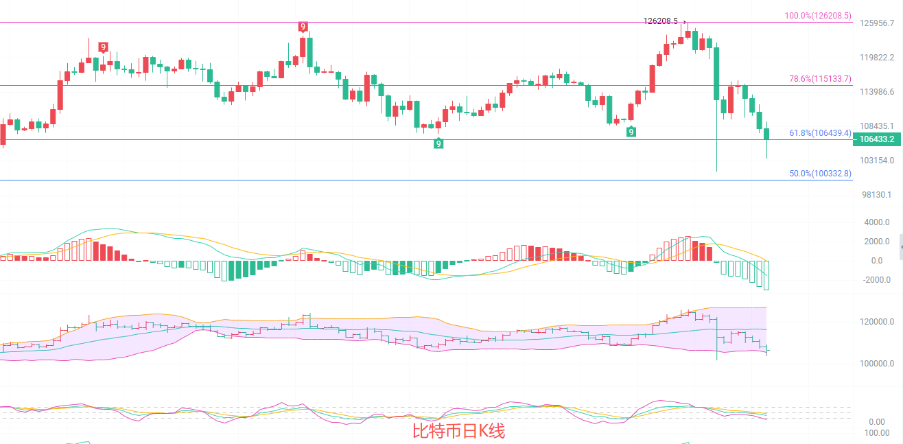 日K线发稿前最高109200,最低103470,原定计划在106400南下全部离场的,最后选择止盈三分之一,剩下继续持有,回调以后可以加仓空,EMA趋势指标开始向下收缩目前已经出现双线死叉,MACD连续缩量增筹,DIF和DEA也跌破了0轴线,加上布林带下轨106500失守,向下开口扩散的趋势出现了,