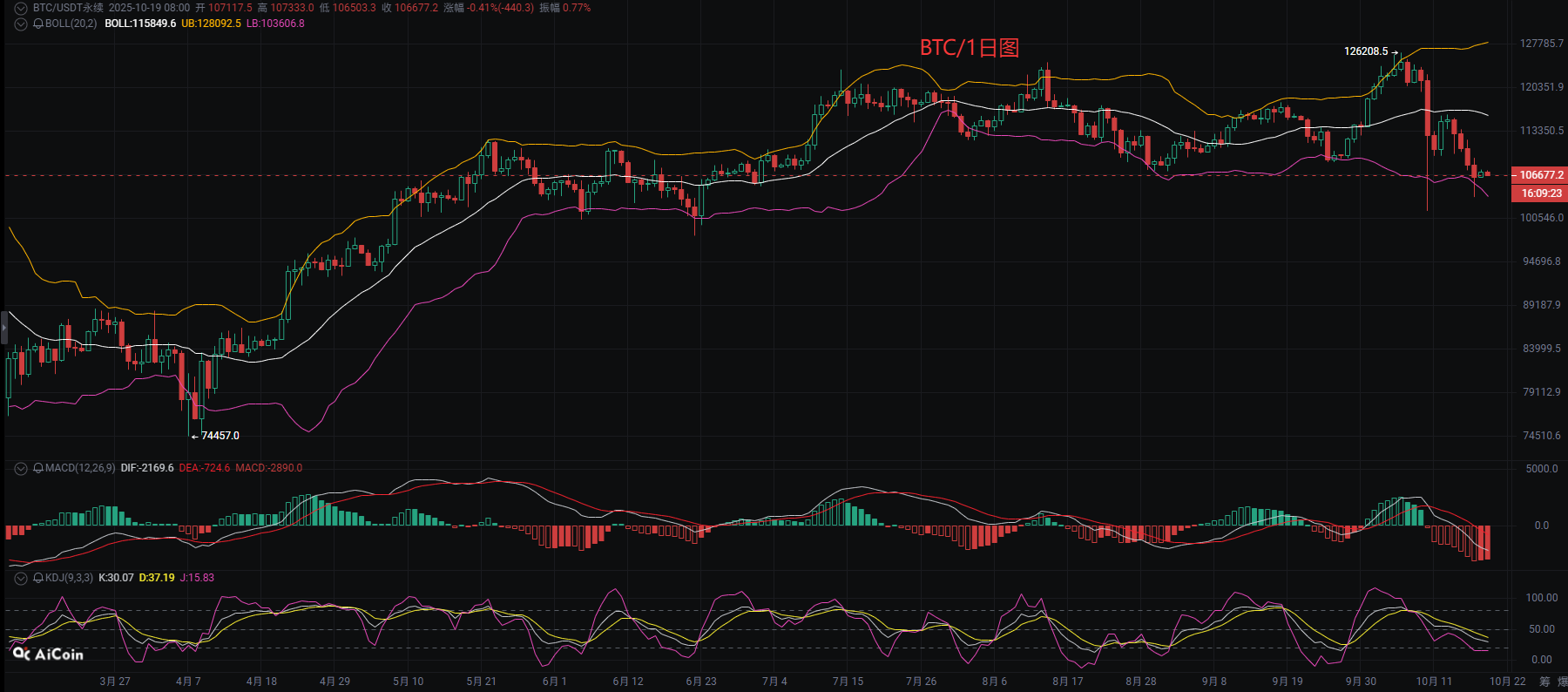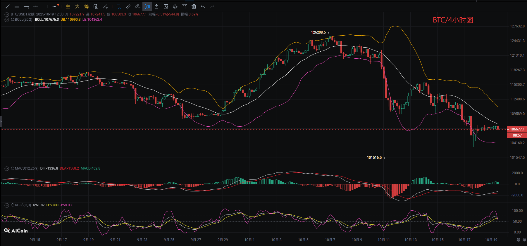目前弱势震荡仍在延续,但是上方阻力在缓慢下移,短周期小时图看,走势在中下轨区域运行,下轨缺口被打开,走势维持弱势震荡,但是并未再度向下破位,所以我们稳健思路反弹做空为主。上方阻力还是关注108000、109500附近,