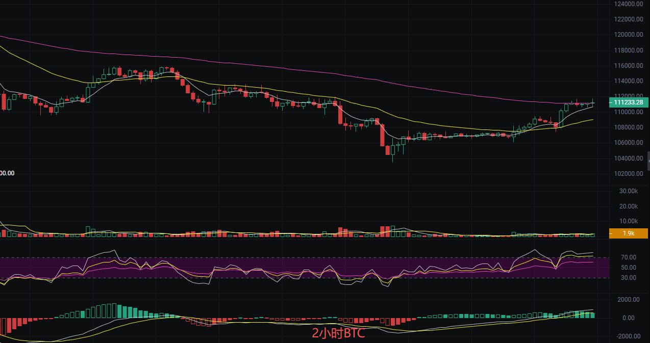 比特币现价111200,丽盈判断大饼已经明确的上涨趋势,黄金交叉与吞没形态的共振表明价格动能持续增强,短期和长期均线的支撑进一步巩固了看涨的市场结构。然而,需注意的是市场处于超买状态,可能引发短期回调压力,这与趋势信号形成一定矛盾。日线两日大幅上涨形成强势反弹趋势呈现长阳线。2小时K线多次突破高点短期处于上行趋势。MACD2小时动能增强日线金叉市场情绪偏多。EMA2小时均线多头排列日线同样保持多头排列,确认中长期趋势向上,趋势出现转变,信号转多,那么思路上丽盈不建议死板做空,而是顺势多为主,做好风控安全第一