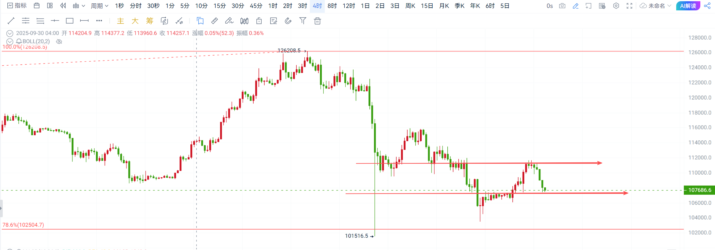 目前行情从日线级别看,大饼连阳直上至压力位110500附近后遇阻回落,前面文章也提过这里是顶底转换处,目前测压后回落,压力依旧有效,下方支撑108000-106000一线,破位则继续下看至102000附近,以太则也是连阳直上至压力位4080附近开始遇阻回落,收线在4000压力位下方,支撑3800-3750一线;
