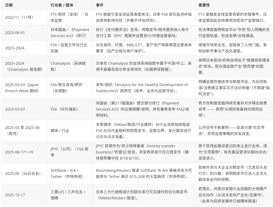 随后2025年8月到来,日本金融厅(FSA)正式批准JPYC公司成为首个计划发行日元稳定币的资金转移服务商软银9月传闻参与Tether 200亿美元融资,标志着日本长达数年的「监管消化期」结束,正式进入「战略执行期」
