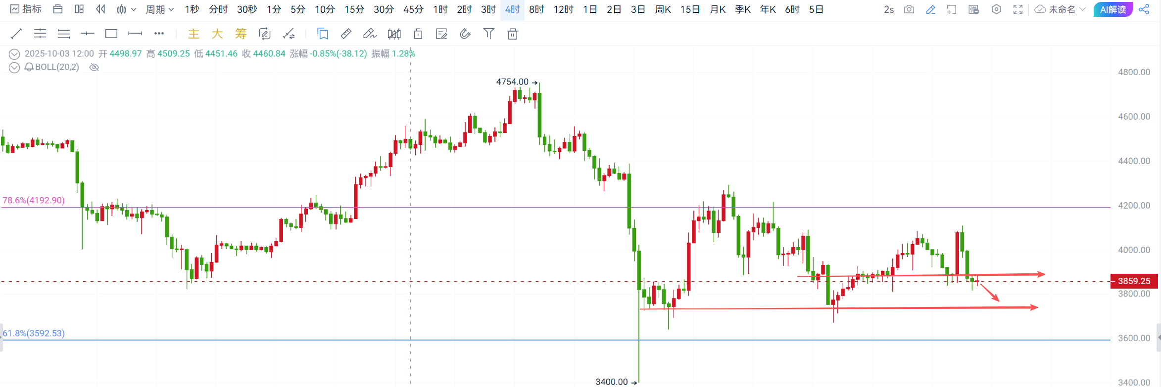 4小时级别看,大饼走出经典画门形态,目前短线压制108500-109000,强压力位110500,支撑依旧108000-106000,逐步下看即可,以太同样在3800-4100走出艺术画门形态,短线压制3900,强压力位4080,支撑3800-3750;