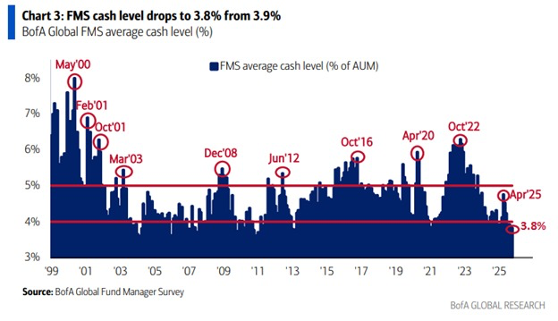 首先是全球基金经理的现金配置,根本最新的数据来看,这个数据已经降低到了 3.8% ,而这个数据的历史最低点是 3.5% ,这就说明了全球基金经理手中的子弹已经不多了,这既是好事,也是坏事,好事在于这些花出去的资金更多到了美股,尤其是AI为首的科技股,但坏消息是,这个基金手中的资金有限,没有足够的能力在市场中继续推高股票价格了。