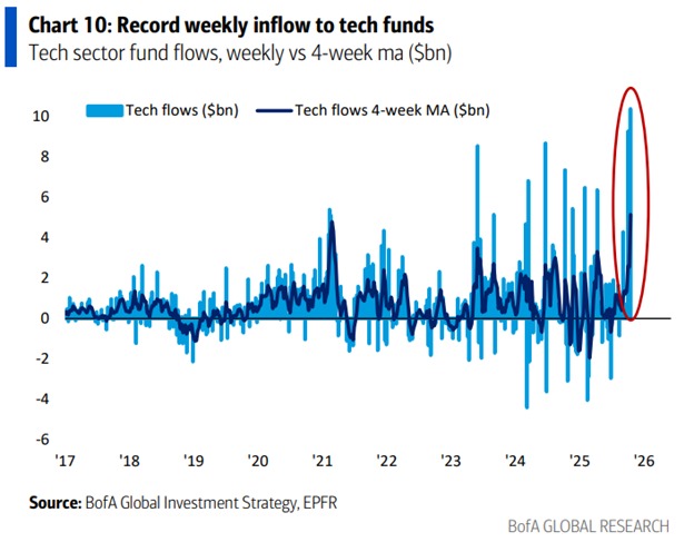 在本周科技股的投资者净流入了 104 亿美元,而上周这个数字则是 92 亿美元,连续两周有将近200 亿美元的净流入,创下有史以来最大的两周净流入量。同时这也是连续第四周资金大幅流入科技股。