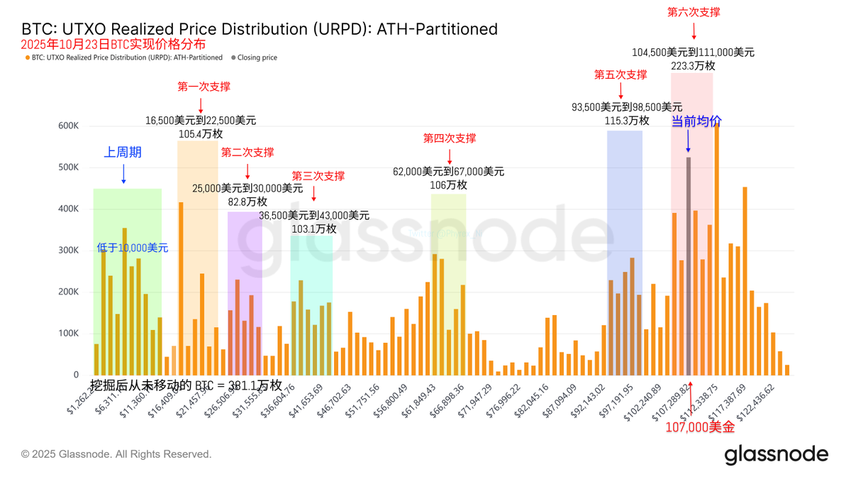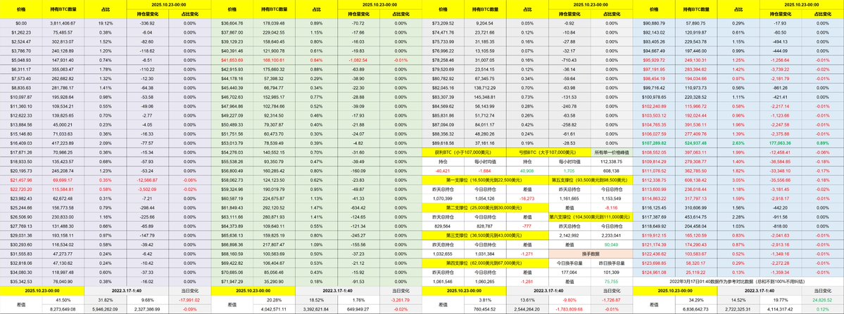 不过从 URPD 的数据来看,现在投资者的反抗意识还是挺强的,104,500 美元到 111,000 美元之间仍然有不少的投资者在买入,但抛售的压力并不是非常大,支撑位置也挺稳定的,甚至是111,500 美元现在还是单一价格持仓 BTC 最多的,暂时也没有发现崩溃。