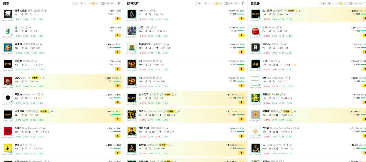 那么,我们该如何利用 Meme Rush 来寻找和参与早期的Meme项目呢?其界面通常分为三个核心区域,代表了项目的不同阶段:新币、即将发行、已迁移。