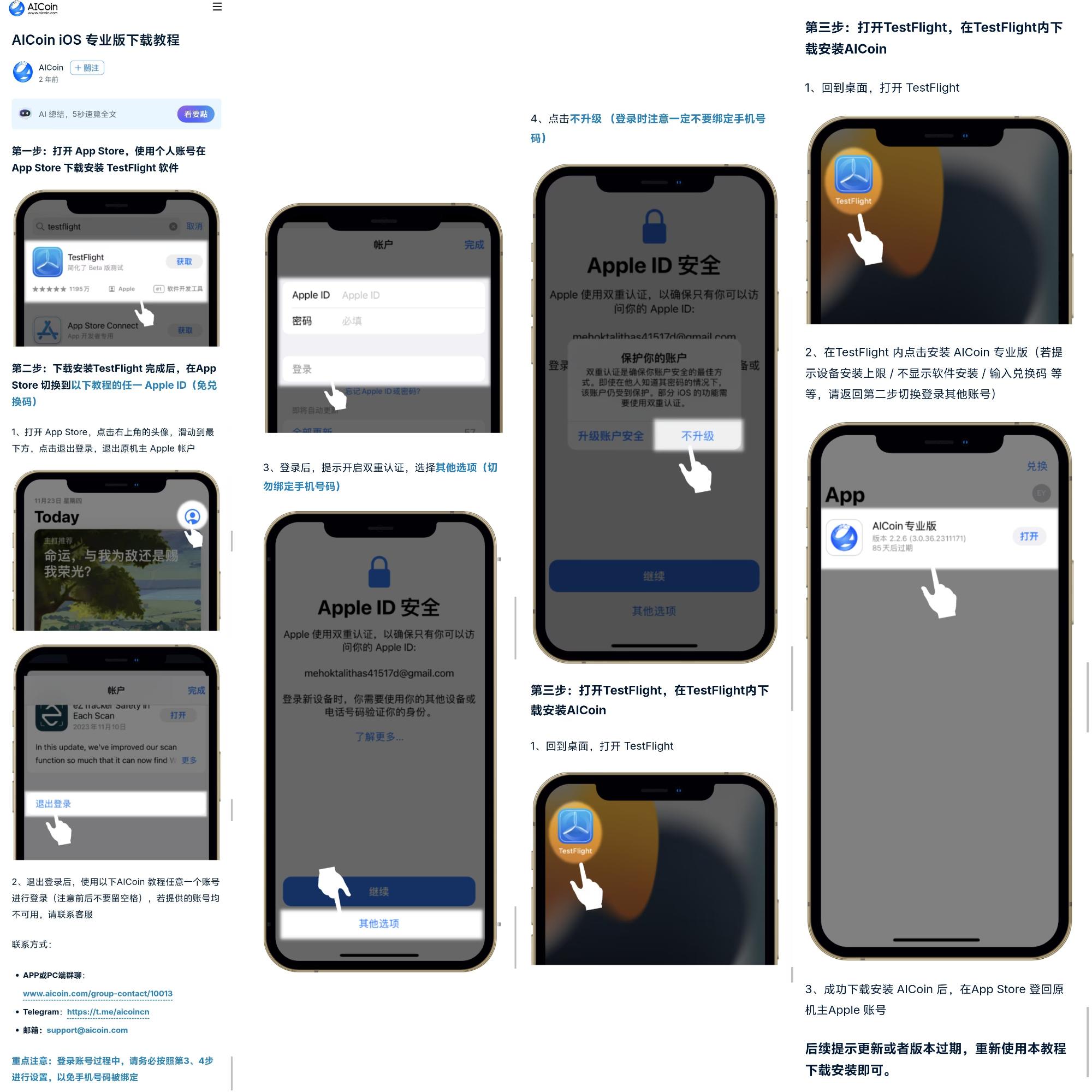 https://www.aicoin.com/zh-Hans/article/303947[Key Steps]: After downloading TestFlight, you need to open the link to obtain a dedicated account password, and log in to the App Store before you can download! Please remember, you need to use this temporary account password to log in to the App Store, do not log into your own phone's iCloud account to avoid unnecessary trouble!