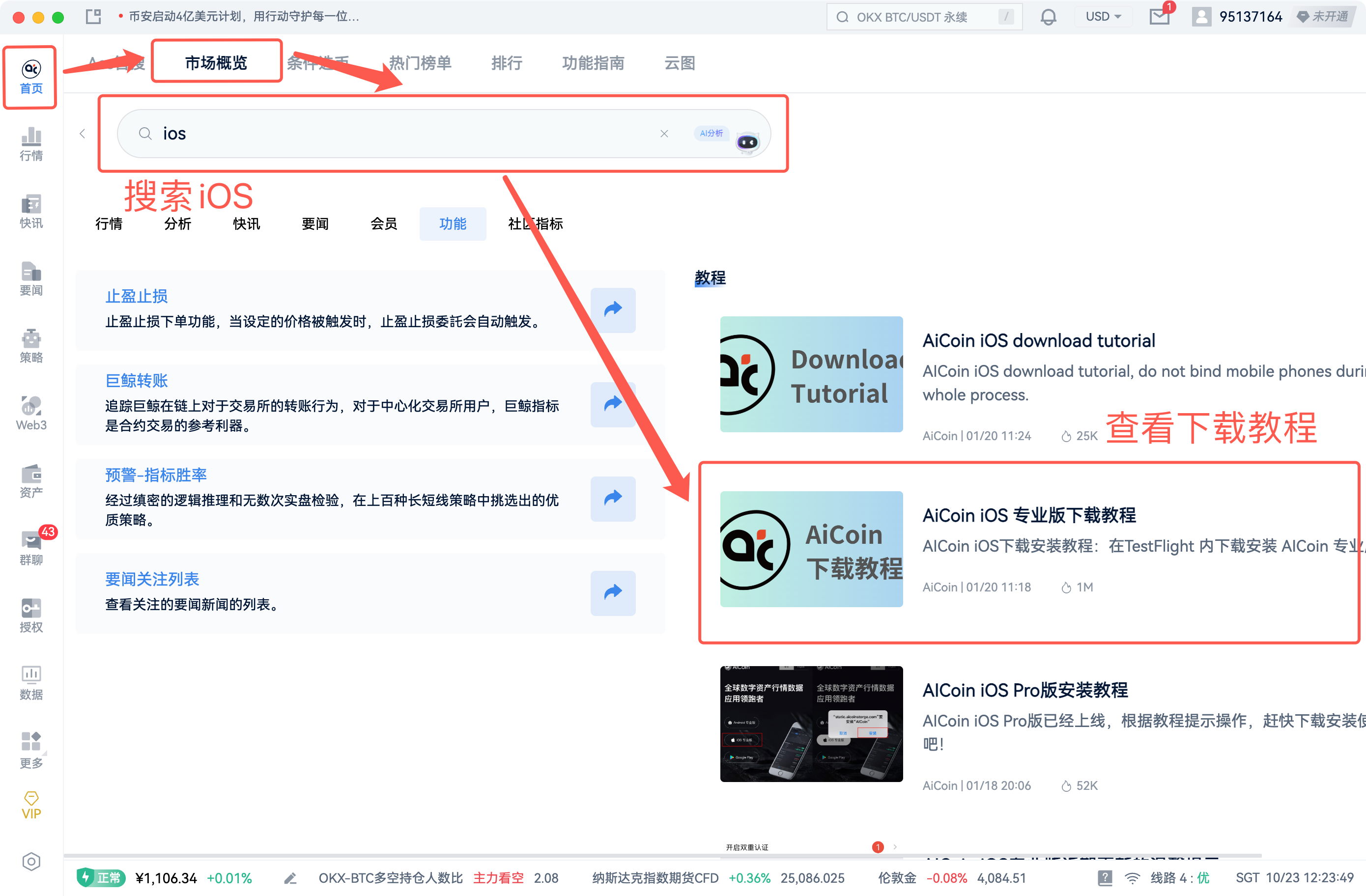 Method 2: Search within the PC product (No network acceleration service required) Operation path: In the PC AiCoin software, go to 【Home】→【Market Overview】→ Top search “iOS” → 【Click the tutorial post on the right column】 to access the download tutorial directly.