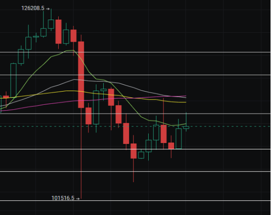 综上:boll的下跌通道收到破坏,同时均线方向也不一致,所以认为后续两天会以震荡为主,震荡区间看107500-112000之间。本周对于空军而言价格最好是能收在107500下方,这样看跌才会更有信心,如果不能就下个周继续看。今天压力看112000-114000,支撑看107500-105000.