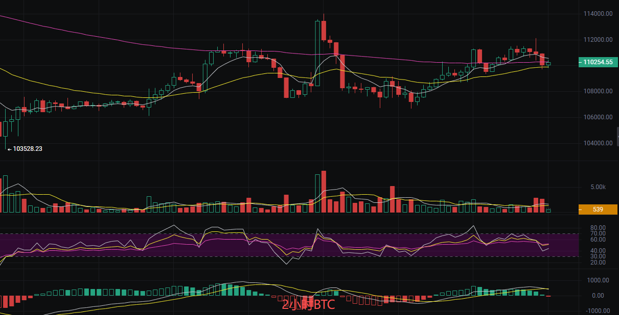The current price of Bitcoin is 110,250. Li Ying assesses that Bitcoin is currently close to a strong support level of 106,665. The technical indicators show some bullish potential, but there is also significant uncertainty. The recent bullish engulfing pattern provides an initial signal for a reversal, and the strength of the support level at 106,665 is high. If this support can be maintained and the upper resistance level of 114,000 can be broken, the market may open up further upward space. However, the moving average system shows a death cross, and both short-term and long-term moving averages are sloping downwards, indicating insufficient market momentum. The 2-hour K-line has formed a doji pattern around 110,000. The daily sentiment is slightly bullish but weakening. The MACD on the 2-hour chart indicates a shift to sideways consolidation in the short term, while the EMA on the 2-hour chart shows strong short-term moving average support. Li Ying believes that short-term longs are effective, but the holding time should not be too long; the focus remains on high-position shorts for stability.