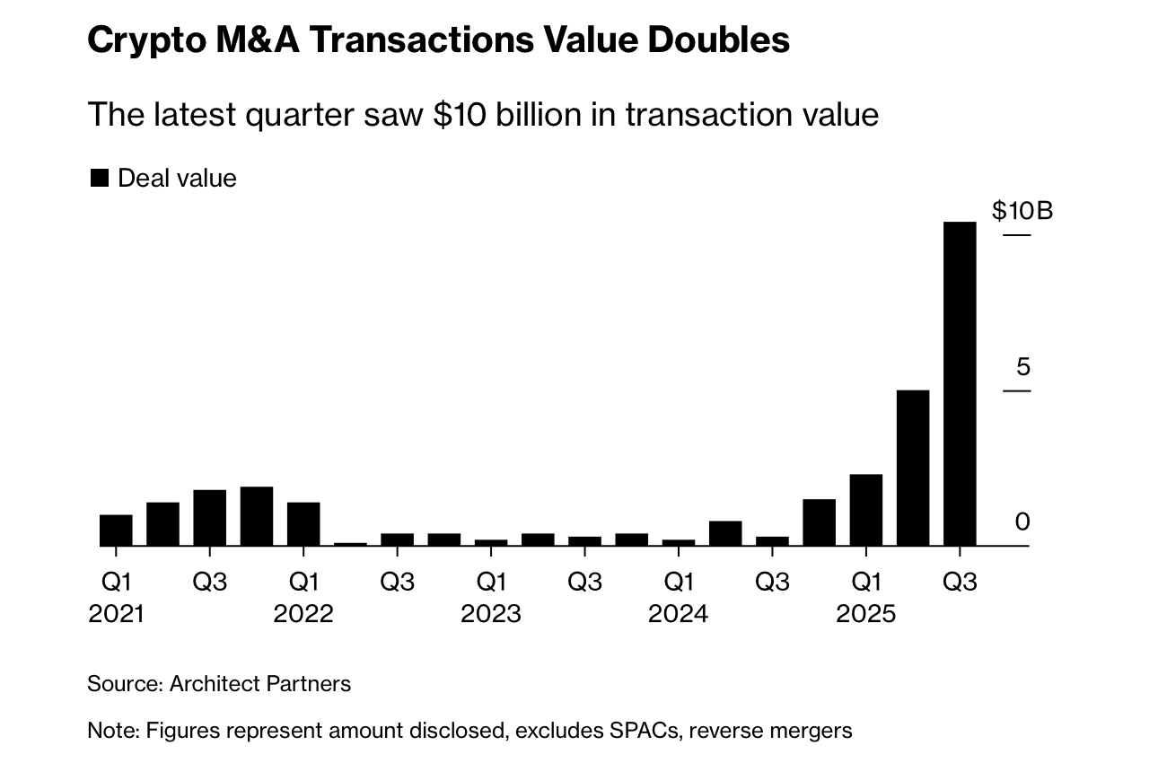彭博社的伊莎贝尔·李和苏瓦什里·戈什报道,数字货币并购(M&A)首次突破100亿美元,标志着该行业从小型初创公司向主要金融参与者的转变。根据Architect Partners的追踪,这些交易包括Falconx收购21shares、Ripple以20亿美元收购GTreasury,以及Coinbase以29亿美元收购Deribit。