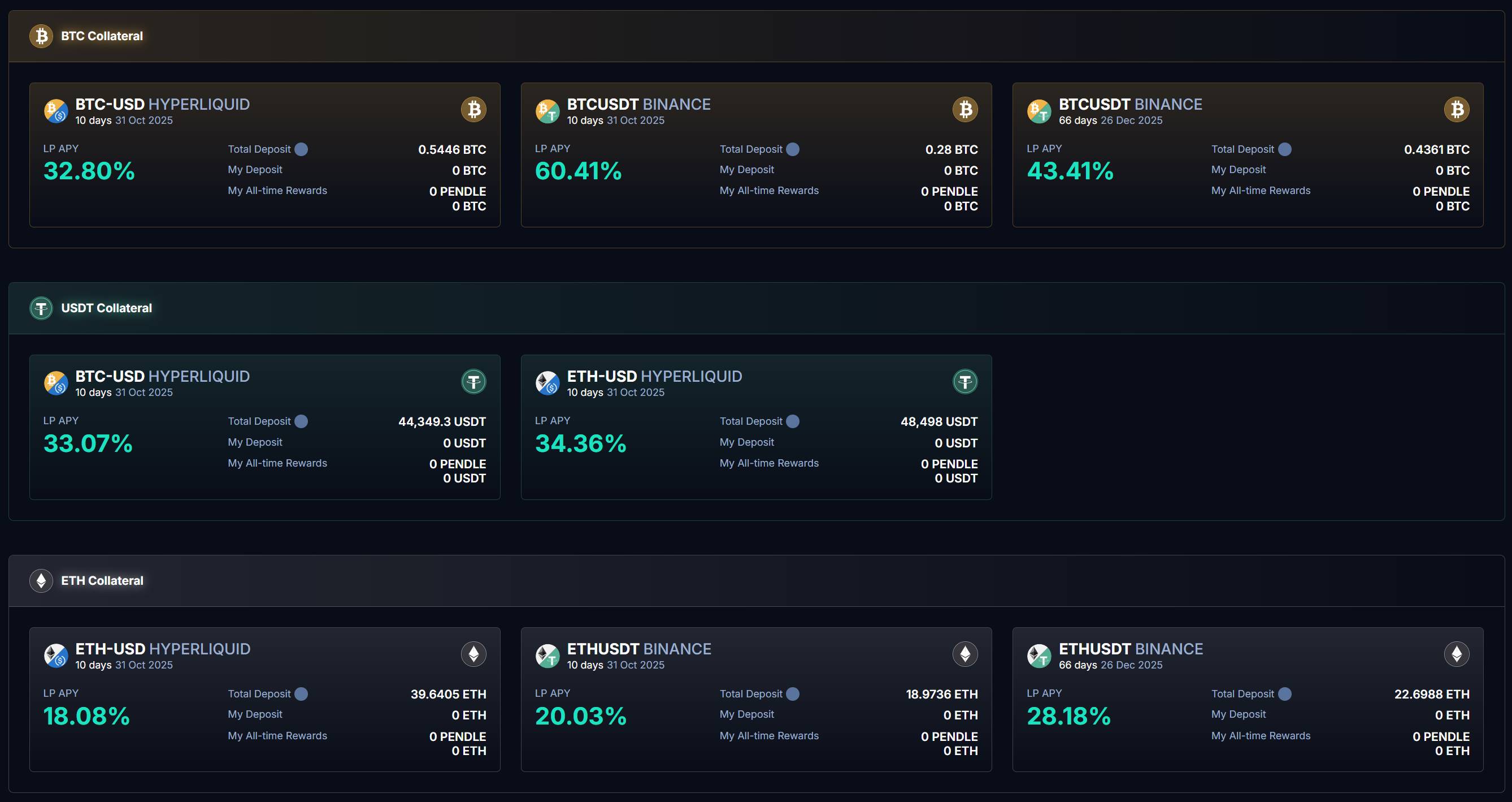 Entering the Boros page, we can see that Boros has currently launched multiple markets for BTC, ETH, and USDT on Binance and Hyperliquid: