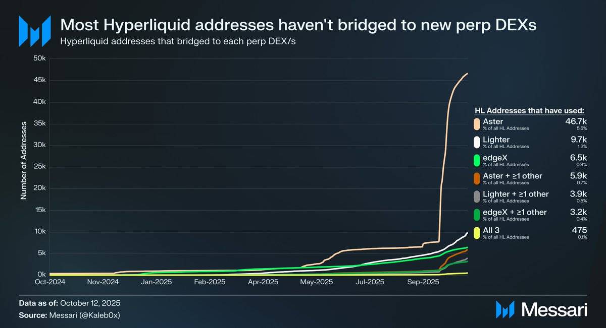 Let’s explore the potential development direction of stock perpetual contracts in the context of Hyperliquid's HIP-3 upgrade. HIP-3 introduces a permissionless perpetual contract market, and data shows that **less than 10% of Hyperliquid addresses have *bridged* to Aster, Lighter, and edgeX, with even fewer users choosing multiple perpetual contract decentralized exchanges (DEXs)**. This indicates that Hyperliquid's capital is sticky and of high quality. Based on this data, the future of stock perpetual contracts can be predicted from two perspectives: