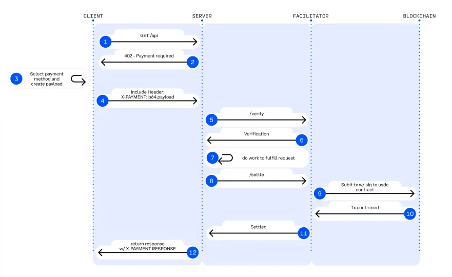 HTTP 402是一个状态码,表示“需要支付”(Payment Required),但长期以来几乎未被使用。x402利用HTTP 402,使得当AI代理发送API请求时,服务器返回HTTP 402状态码,指示需要支付费用。AI代理接收到这一响应后,会支付所需金额的稳定币。具体流程如下: