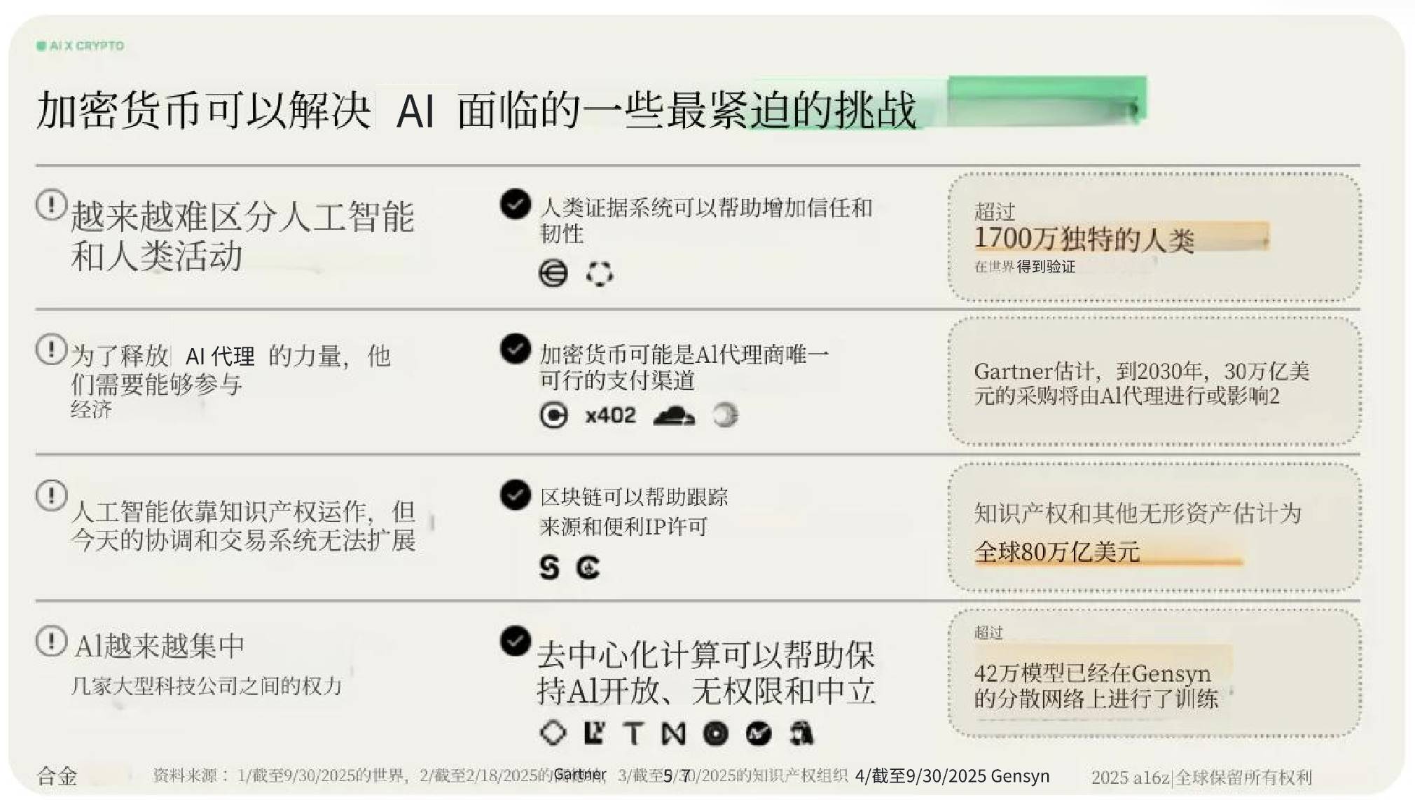 • 尽管如此,Gartner 预测,到2030年,AI代理控制的交易额将达到30万亿美元。代理性商业因此将成为未来不可避免的庞大市场。这也将成为区块链继稳定币之后找到第二个全球产品市场契合点(PMF)的关键时刻。