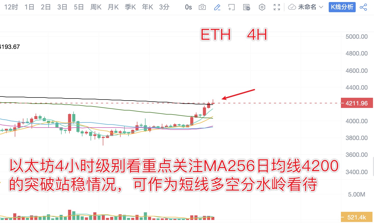 以太坊从日线图上看,昨日日线收大阳价格强势突破MA30日均线,目前临近MA60日均线4250一线压力位,关注4250的突破站稳情况,4小时级别看目前价格同样临近MA256日均线4200压力位,关注此一线的突破站稳情况,可作为短线的多空分水岭看待。